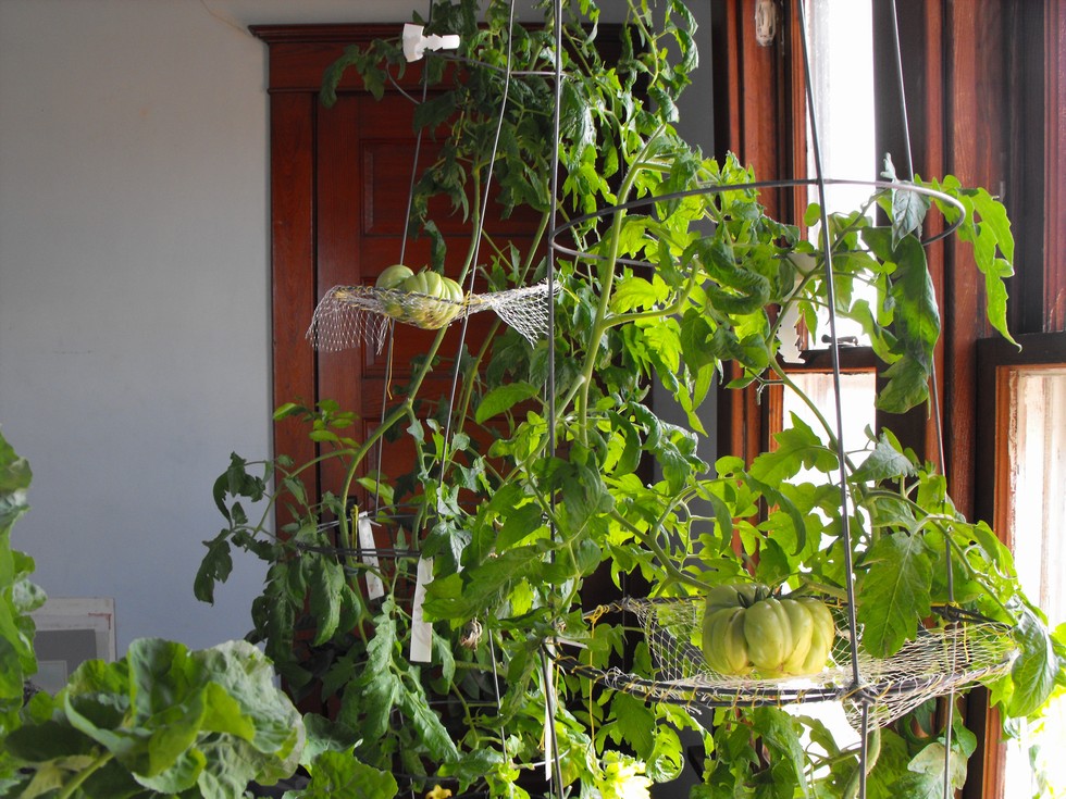 Closer shot. The far tomato is Mater #2 and has caught up to Mater#1 within a 1/2" dia. They are both putting on between 1/2" - 3/4" per day in diameter but also putting on hieght as well. There is alot of unexpected upwards pressure on the stems so I need to lower the potato mesh abit to releave pressure. I'm starting the Foss, Finders, Hunt, etc competition plants today also.