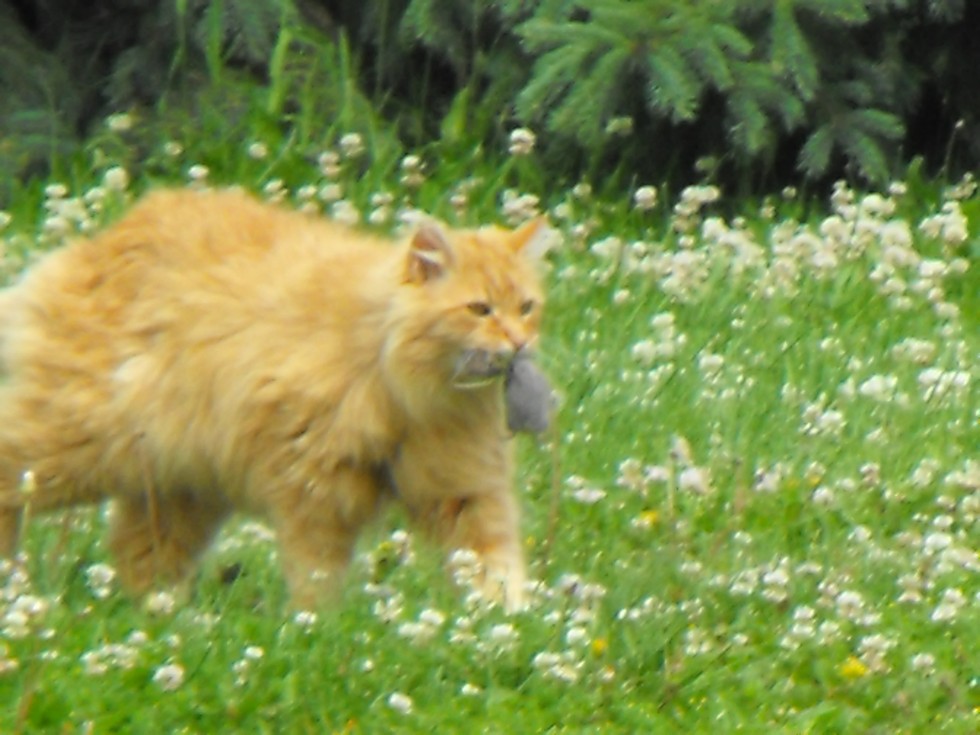 Our Big Maincoon Cat "Sam" was about 75 yards from me so I 12 zoomed in on him and took a few pics. It wasn't until I uploaded the pics that I saw he had a mouse in his clutches. Needless to say he got Xtra Treats. Good Boy