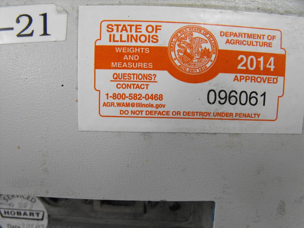 Scale Cert. Decal at the County Market Deli in Carthage, Illinois. Dang they sell good fried chicken there,lol.