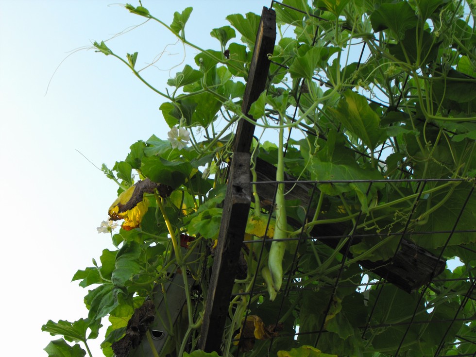 Lg's have grown alot past couple of days. Culled off it seems about 8 Billion other females on the vine this morning. I've grown Long Gourds now for two years but man-o-man.. this plant is female bloom crazy!!! Will let these two grow together for a few more days and make a cull on the slowest one.