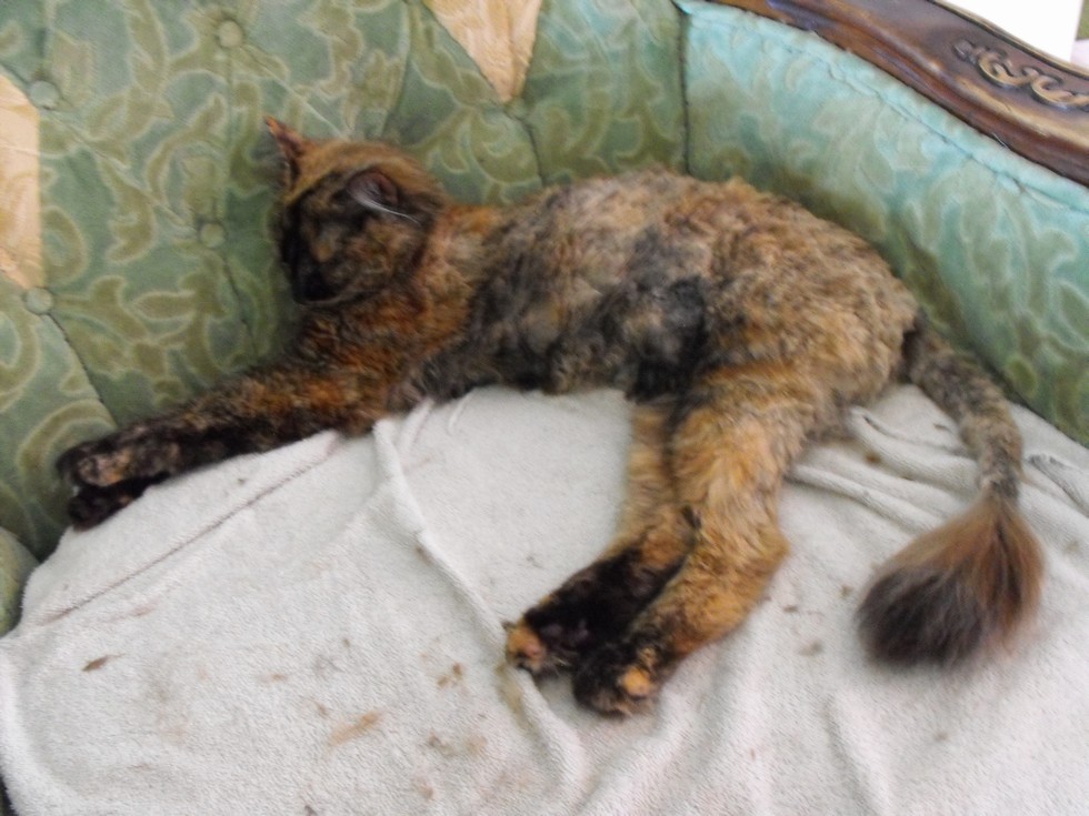 I happened to look out the window to see my daughters cats sitting in the shade two days ago with their mouths wide open...Heat index was @ 108 F with 98% Humidity. I went out to get them and Stella Pictured, couldn't move very well so I knew she was seriously over heated. She is a Long Haired Tortious Shell Maincoon. She was pretty much lathargic and needed cooling off fast. I cut most of her hair off with scissors, as you can see in the pic, cooled her off with water and a fan. It will all grow back fine and she is doing much better now. The vet told me they would have done basically the same thing. Yes I had to leave that bushy part on the tail,lol. They had water but still the heat can get your animals fast and unexpectedly.