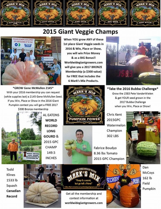 Revised Poster 12/19/15 There was a little confusion with the last poster stating "2145 Gene McMullen Contest" There is no 2145 contest.You can grow the 2145 in the Giant Pumpkin contest if you join & commit to growing the 2145 seed in 2016.You can request a 2145 while supplies last for your $35 membership.We are looking to grow this great Hobby?Sport.Its not about money,Butt having prize money is like playing Poker for pocket change.It makes the game more fun.So please join us in our quest to make this sport the best game in around.As this WWGG site grows with our how to grow giants memberships.WWGG will also give back to the GPC I would like to get a Howard Dill National Award going each year & sponsor this for the GPC awards.Check out our Product success's from 2015 NEW WR LongGourd 302 lb Watermelon 2145lb Pumpkin.1533 lb Squash.162lb field pumpkin & more