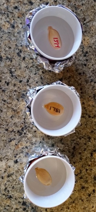 Seeds were soaked for 8 hours in distilled water. Cups were placed on a heat mat to keep the water warm. The seed edges were not filed.