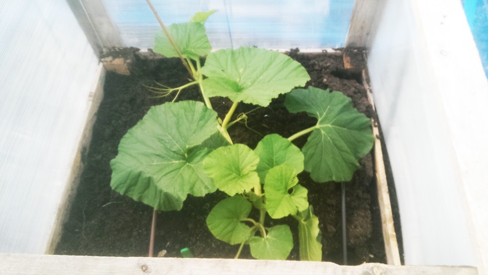 This is the 333 and as you can see it's almost outgrown the 1 metre square cloche. The fact that it was small and tight, and surrounded by mesh fencing, meant the winds didn't affect it so much, so the only damage in the storm was just one bent stem. I hope the weather improves so I can remove the cloche completely.