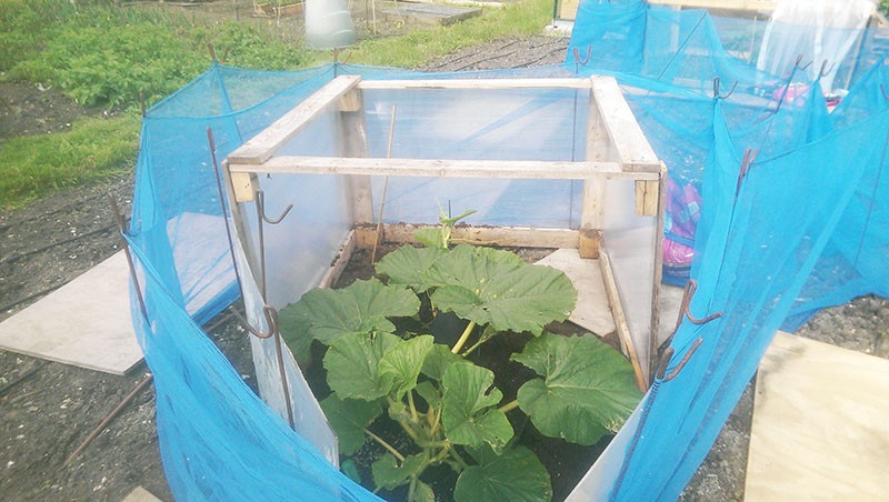 Here is the 333 with a lot of wind protection. Ideally I'd like to grow pumpkins in a polytunnel but that will have to wait until next year. Untill then I will just have to deal as best I can with bent leaves, broken stems and stressed roots due to wind which occurs even at low speeds. I'm moving the cloche forward about 6" every day as the vine lengthens. Some good news is that the soil pH is down from 7.6 last year to a very comfortable 6.8, no doubt due to the sulphur that I added all those months ago!