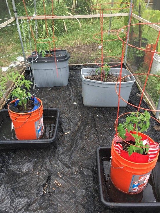 Submitted by Ed Olsen-Moore...received two giant tomato plants and then received two extras...he decided that the orange bucket in the front on the left will be his 5 gallon bucket challenge entry...he modified his bucket for the challenge...his bucket has a row of holes on outside bottom; about 1-1/2" of clay pebbles covered with several layers of weed cloth on all sides...soil in cloth type Walmart bag. Will use ph adjusted hydroponic solution to water from bottom.