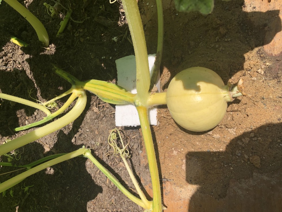 This is my very slow growing 2169 (12 dap) with the split vine and I'm thinking it is going to be culled soon. Pollinated another pumpkin on July 2nd with the 2365 that will hopefully be my keeper.