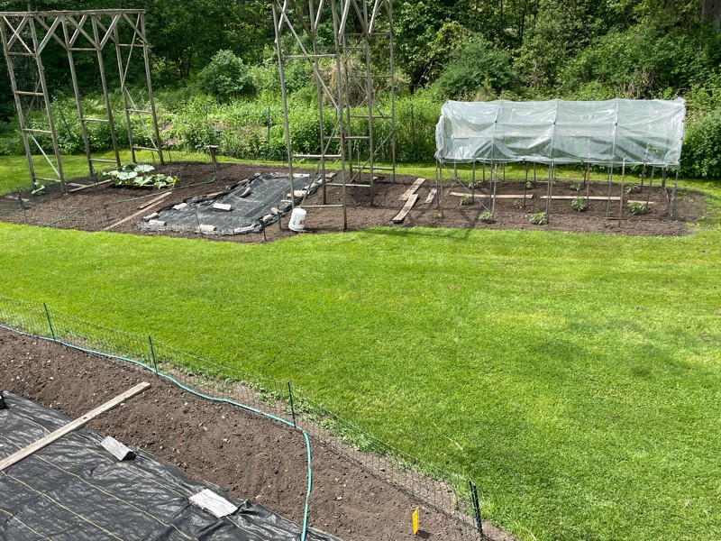 The old patch plants have all been in the ground for 6 days now except for the pumpkin. We had 3 nights in the 40's this week and one in the 30's. Overall we are happy that we didn't lose any plants but growth has been slow.