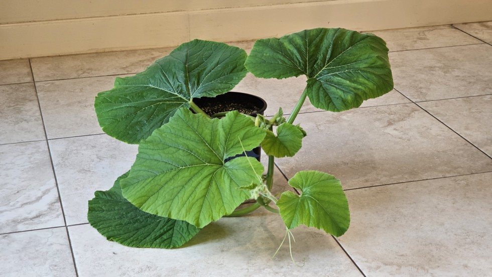 This is the "white tipped" Chan 2252.5. It's been growing in the same 1 gal pot that it started out in. I'm posting this picture for 2 reasons. The 1st is to demonstrated that a white tipped seed is normal and ok to grow. The 2nd reason is to demonstrate that pumpkins will grow using 20-20-20 fertilizer as it's only source of nutrients. In fact my wife grew a 892 lbs Howard Dill winner using only 20-20-20 all year. It was the Love 892. So if you are just starting this hobby and want to grow a giant pumpkin, you can use 20-20-20 as your nutrient source until you learn more about fertilizers and soil.