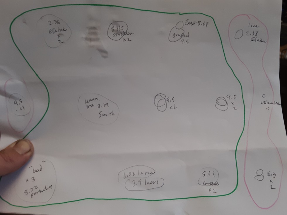 Final layout in the tomato hut. Not sure if it will be legible but there are 13 spots. Only the 9 spots in the green circle are performing well , the outter ones circled in pink are too far from the good soil apparently, as they are not doing so well.