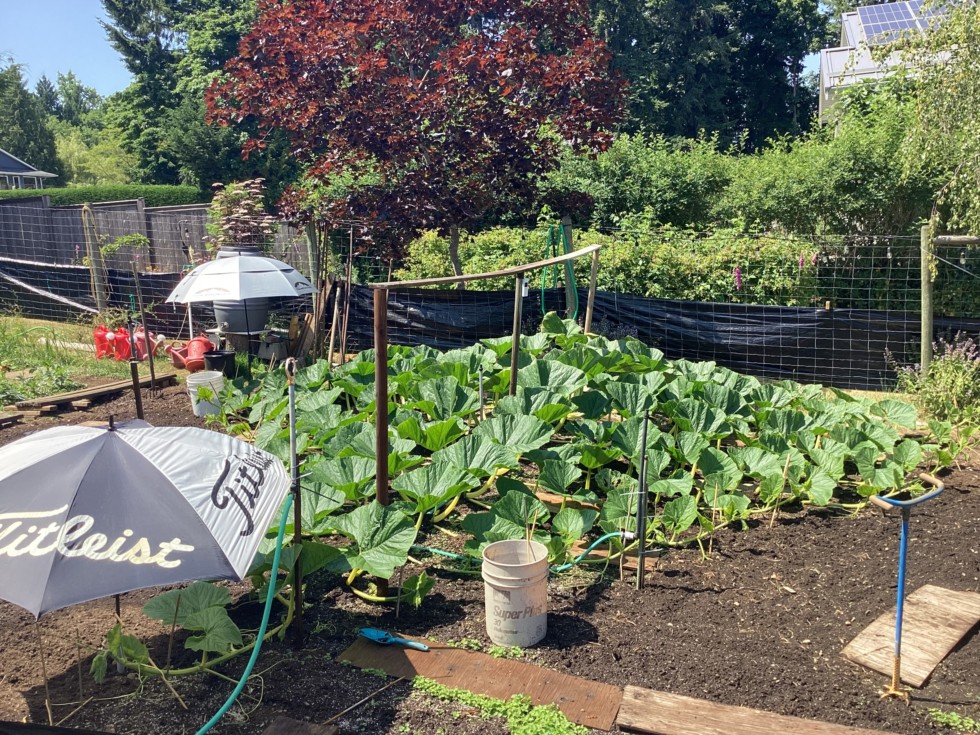 Weeding and vine positioning and burying tap roots every day now as the plant pops new root growth rapidly and especially overnight. Plant is filling in quickly, we will likely have the first few secondaries terminated even before pollination. Plants really seem to respond to the liquid Shuttle 14 products called Rooting, Sustenance and Harden, check them out on the Shuttle 14 website.