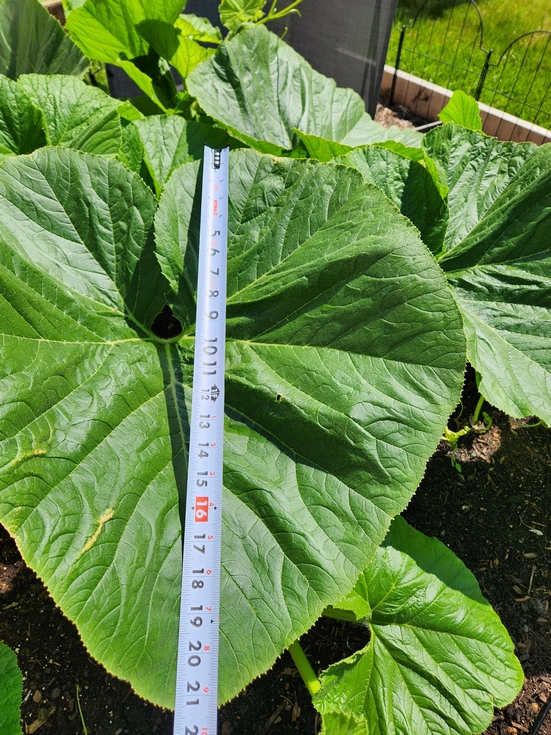 We have a pumpkin leaf on the 150sf plant that has reached 21.5". There are three more over 20".