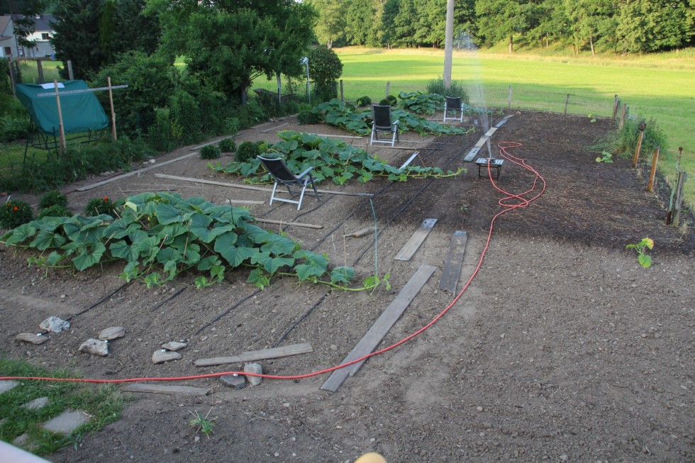 Patch today :) Now I have removed all of the Phacelia. Wondering as to why I put the sprinkler on the bare soil rather than over the AG plants? Simple reason: I want to make use of wet soil and warm weather to get some remaining weed seeds pop open, just to disturb the weed seedlings with a hoe (to let them roast in the sun) in the next two weeks as long as it is easy to treat this area before it will be covered by the AG plants.