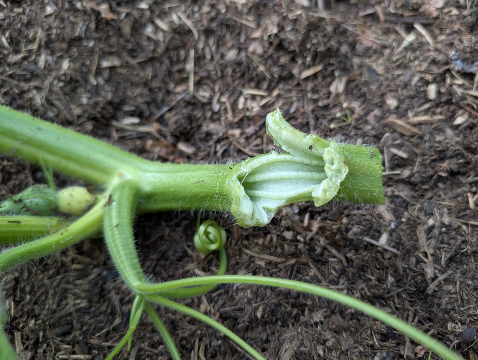 Now I've lost the growing tips of both 1526 Miller plants due to wind. Lesson learned: keep the wind shield up permanently and always support the last 2-3' of the main stem at multiple locations, including propping up temporarily with dirt till it wants to lay down. Training a secondary on each plant to be the new main.