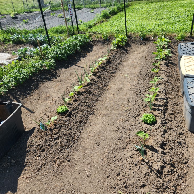 Beans and potatoes. I am trying green beans in the middle row and yellow beans on the right. I also planted beets and interplanted onions and basil. Along the back fence, I planted the adopted basil and hot peppers and leeks. Beyond in plot 145, I have cover crops growing containing buckwheat, mustard and alfalfa.