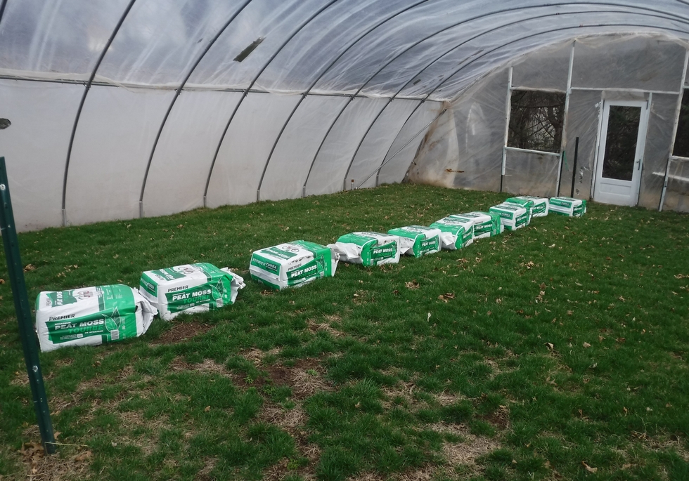 While the structure still needs some key components (shutter vents to be installed for one) the soil also needs some preparation work. While this may be early in the season, with the plastic cover the risk for flushing out any amendments is reduced so going in early is justified. This area is about 32ft. x 40ft. with 30 cubic feet of Peat Moss being added along with 50lb of lime and 20 pounds of 0-0-50. This will be tilled in with the grass before applying OxiDate 5.0 as a drench followed by weed block. On top of this will be a smaller cold-frame (12ft. long x 8ft. wide) that the plants will go into "soon".