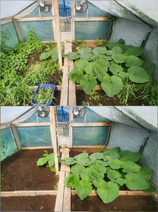 150 square foot challenge plant: Weeded and vines buried on the 2085 Toboyek. We should be pollinating a pumpkin in about a week if everything goes to plan.