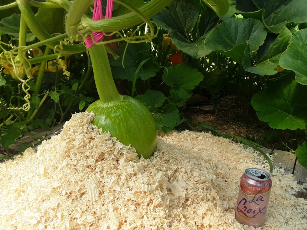 Sassy the Squash. I don't think the wood shavings are a great idea but for now they are supporting (and shading) the squash.