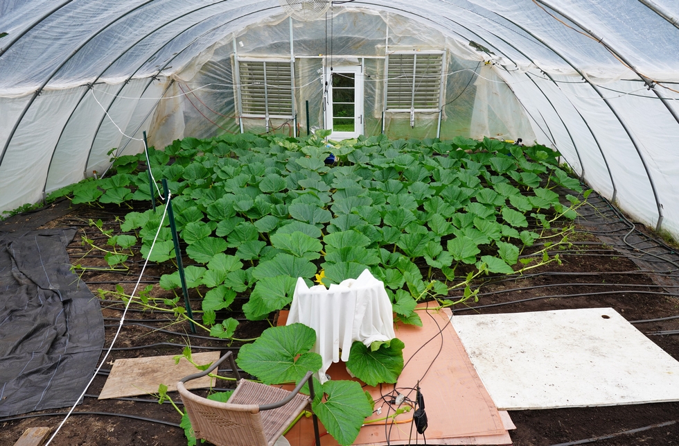 The hope is the pumpkin will grow onto this section and if needed mill fabric can be easily added, but at this point, safer grower access is preferred.