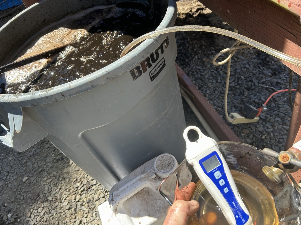 I just mixed up a vat of what I am going to feed through my drip lines for the next couple days. After I put everything in (micronutrients, cal-mag, companion, essential, Valley Ag Bios (the worlds cheapest micronutrients, but they have super high concentrations of good stuff), 12-4-12, & an ounce of boron) I take a sample of it from a hose bib I have which is AFTER the fertilizer injector.