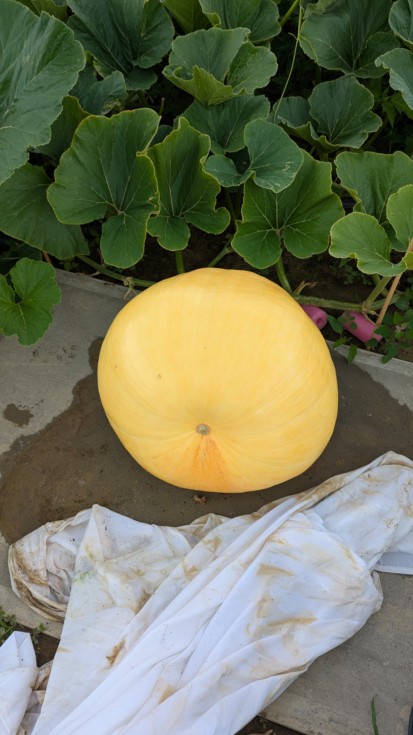 2344 Wallace x 1727 Jacobus DAP 23, not growing much, I lost the main vine behind this pumpkin, this is growing on what's left of the main beyond the rotten spot, growing on about 10 secondaries and the rest of the main which is turning yellow. The area below the blossom concerns me. Hoped for seeds here but idk