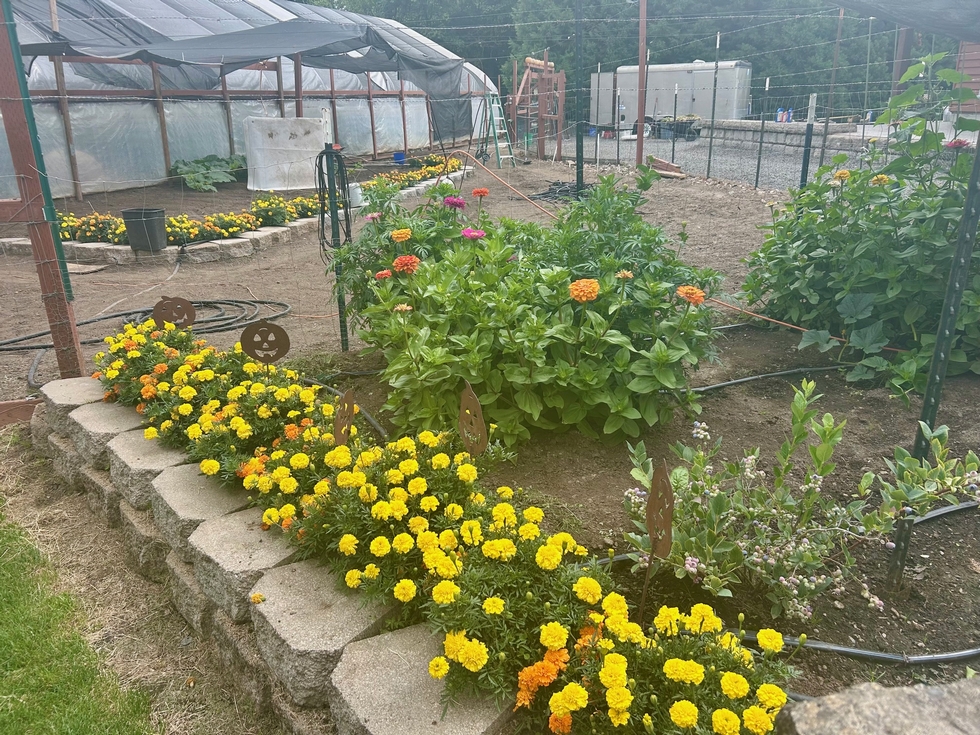 I've never planted flowers along with my pumpkins before. What I have learned is that if you water your flowers with your pumpkin feed lines, then you will have fantastic flowers! I also learned that my pumpkin pruning habits carry over to dead heading flowers. Apparently my wife is correct: I am neurotic.