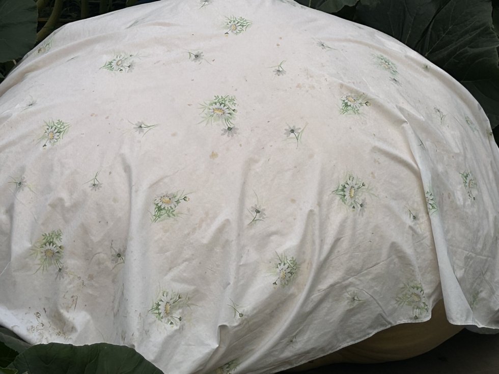 My 2465 fruit is starting to sap up! This morning it was stuck to its sheet. If you look at this pic closely you can see the little spots where the sap is coming up through the sheet. Any time I've had pumpkins which do this they have been crazy heavy. I like it!