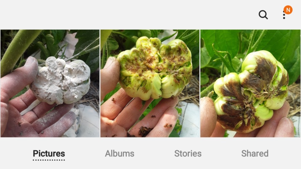 Right to left: R: Bad case of blossom end rot (BER). M: Removing the dead tomato/ exposing the live tomato. L: generously dusting it with something to maybe help heal and reduce infection (perhaps not necessary).
