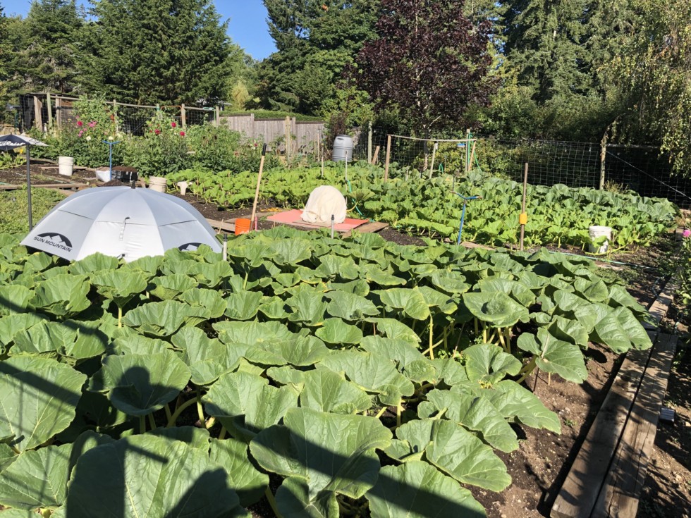 Prizewinner plant in the foreground with the still not photoworthy pumpkin on the 2404 Barron plant in the back. The dahlias are just starting to explode with flowers now too.