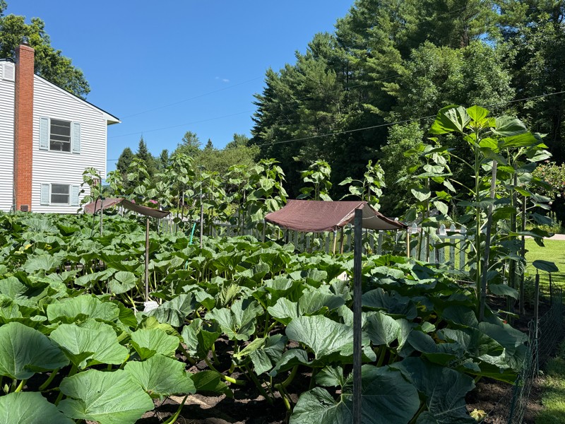 Here is a different view of the sunflowers. The tallest is probably only around 9 feet. Either they are slow growing or this will be a semi tall sunflower year.