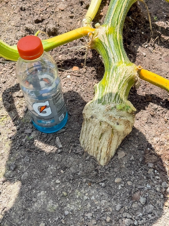 Stump view of the 2006, which unfortunately was pulled out today due to disease. Seemed healthy until the pumpkin aborted after day 20. Could not get any fruit to set, and more vines kept turning yellow and rotting. Stump was healthy with great roots.