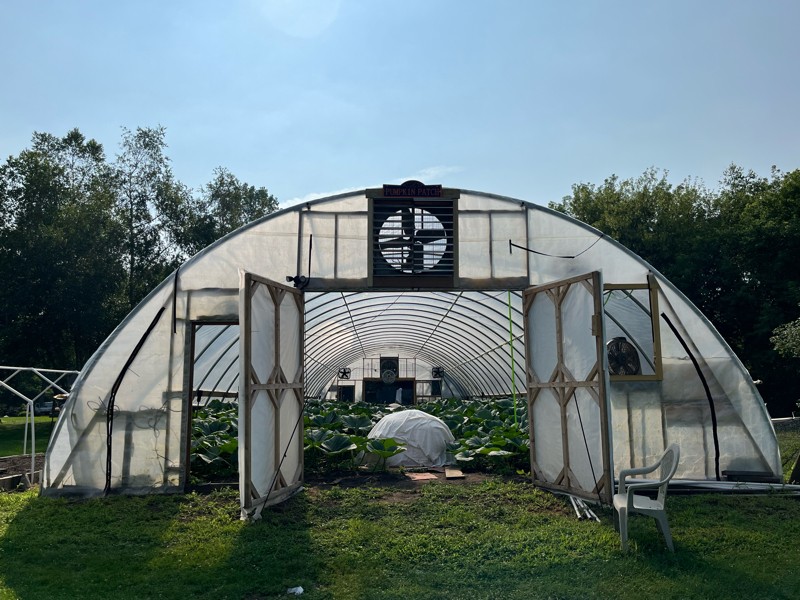 The greenhouse will be on lockdown mode later today. This angle shows one of Gene's 2198 Sperry plants. All three pumpkins in the greenhouse are now estimated over 1000 pounds.