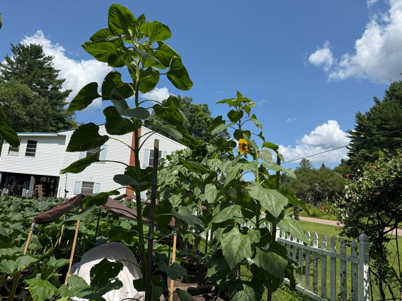 The giant sunflowers are doing ok with the tallest around 12 feet. We will be shorter than past years but still eye catching! The closest one that is starting to bloom is from a 21 inch wide head seed. Time will tell if we can get anywhere near that.