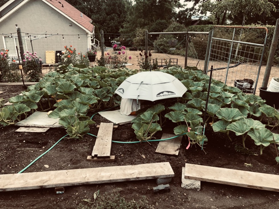 Prizewinner plant has another baby way out on a secondary that we decided to keep. Trimmed out a small area, laid down some plywood and mill fabric and will likely put up another golf umbrella to keep it dry.