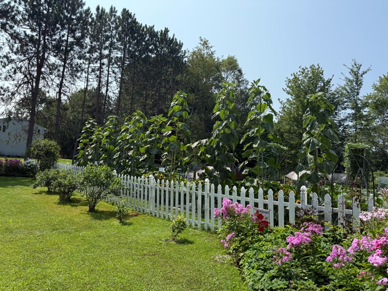 Sunflowers are slowing down but are still magical. Tallest is about 14.5 feet.