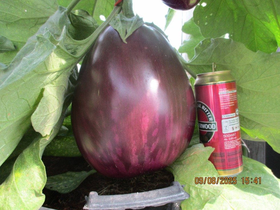 Good Aubergine, very sound but will not keep 6 weeks for Malvern show. Exceptionally sunny/dry/hot spring & summer has brought giants on to soon.