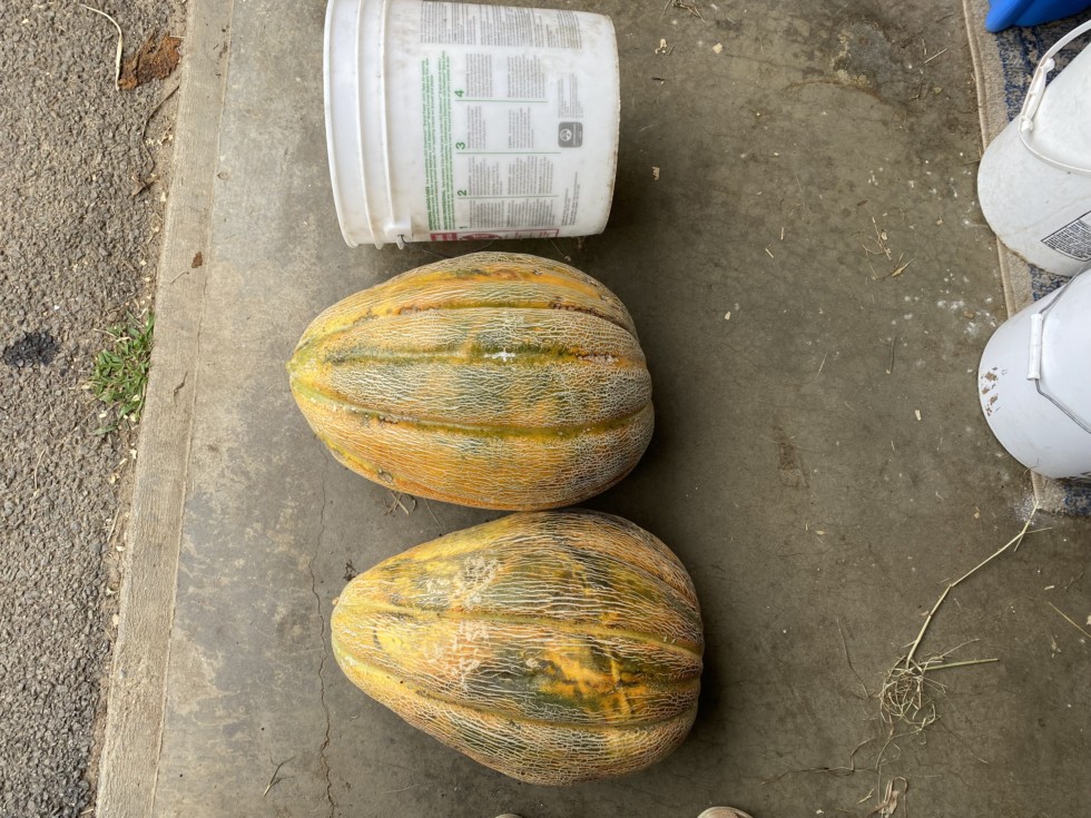 56.2 English cantaloupe. The middle one weighed 34 pounds. The other one maybe 25. The plant got wilt about a month ago. It really stopped growing at that point. I just let them sit on the diseased vine until the fruit ripened.