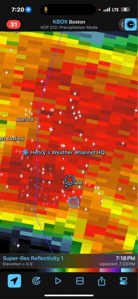 Topsfield got absolutely hammered yesterday evening with 2.5" of rain in 1 hour and over 100 cloud to ground lightning strikes! Several roads were flooded
