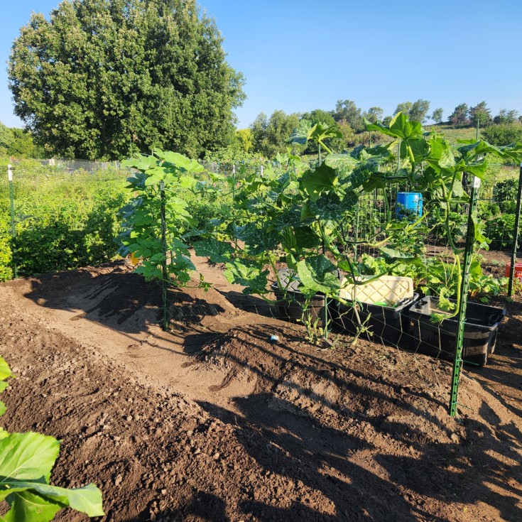 Butternut squash and pumpkin growing vertically. I'm trying this method this go around. I do like being able to pick off the dreaded squash bug. I've noticed cucumber beetle eggs scattered on a few leaf underside. I cut those leaves off. I smash every squash bug I find. I think they're laughing at me because I see them hanging out even in my nearby raddish leaves. DEATH AWAITS!!