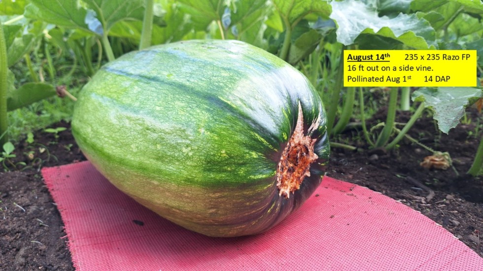This 235 x 235 Razo Field Pumpkin was pollinated on August 1st on a side vine at about 16 ft out. Shown at 14 DAP. Hopefully its the keeper.