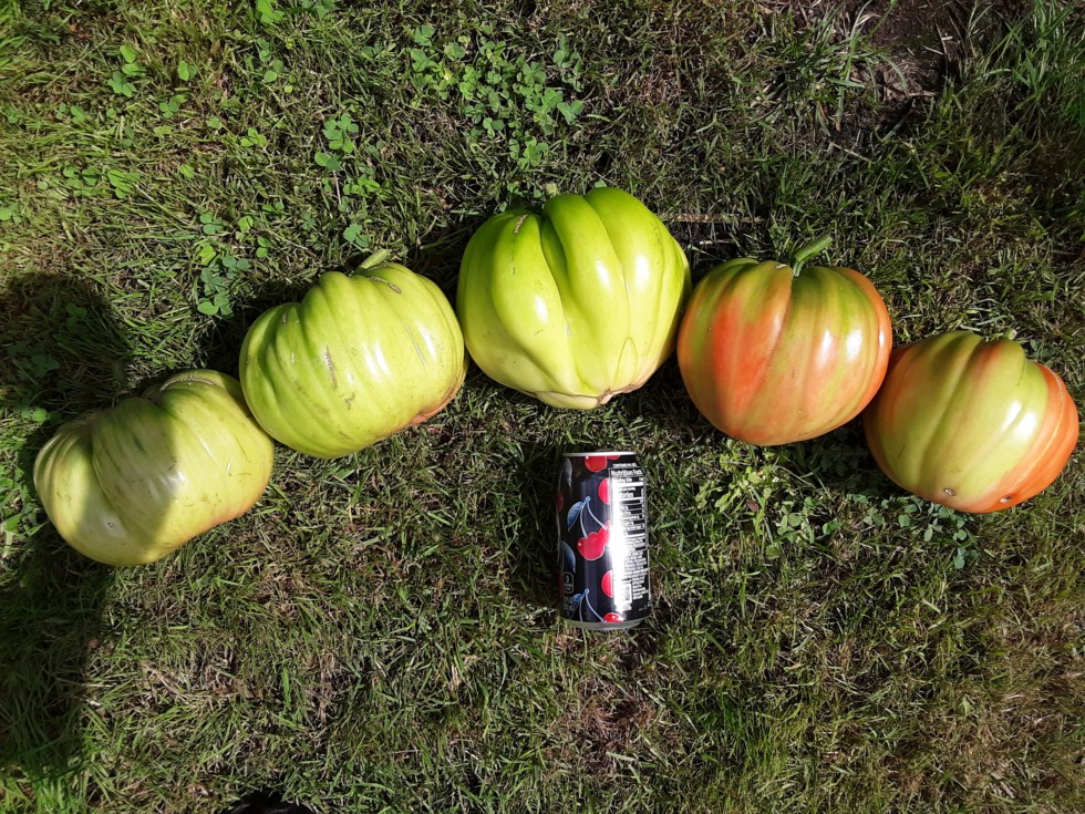 Six 9.5 Clayton singles (but another similar sized one got beyond ripe and is not pictured)... three were grown on each plant, set on the first truss after the main set failed... Some of these were very small blossoms that I allowed to grow out of curiosity. The middle one was on the grafted plant. Clearly the biggest. The grafted ones look more plump. But perhaps the flowers didnt have much inherent potential as the other ones?