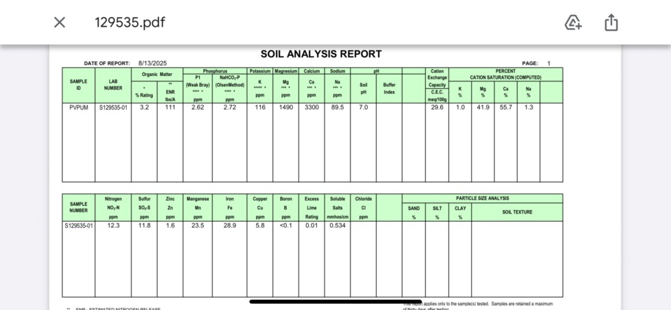 I've always just done spring and fall soil tests but decided to try taking a sample a week or so ago from underneath my plant canopy along my drip tape lines. When I got the sample back I almost didn't believe it was my soil. I have a very heavy, high magnesium, high CEC soil. My philosophy has always been to front load fertility, push high organic matter through compost and cover crops, and feed very minimally through the growing season. I run approximately 425 gallons of water per day to the 3000 square foot patch. Fertilizers applied before the sample were probably a couple gallons of 6-5-6, some kelp, humic, and other biologicals. I also had been adding 1/4 cup of fertibor, 1/8 cup zinc sulfate, 1/8 cup manganese sulfate, and 1/10 cup copper sulfate to the patch each week. The plants don't look like hungry, but this really has me thinking. Granted, the sample was taken along the drip tape lines, so I think this skews the numbers down a bit, but I think this really shows how much fertility a big plant can pull from even a really heavy soil. I'm going to bump my fertilizer a bit from here out after seeing this.