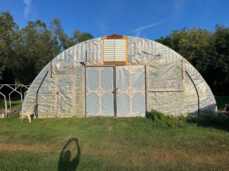 The nights are getting cool already! Gene has the greenhouse closed up early to retain some of the daytime heat. End vents are covered and sides are down. Blankets have replaced sheets on the pumpkins.
