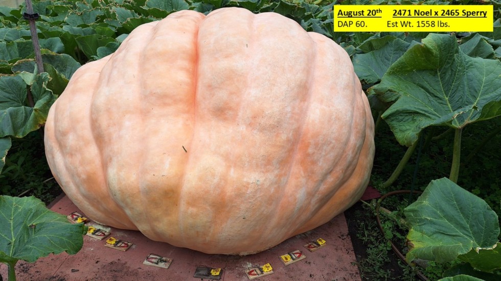 The 2471 Noel x 2465 Sperry Pumpkin, shown at DAP 60, is still growing at an average of 29 ;bs/day for the last 20 days. Est wt by the chart is 1558 pounds. The Ring of Death is working to control the mice and moles