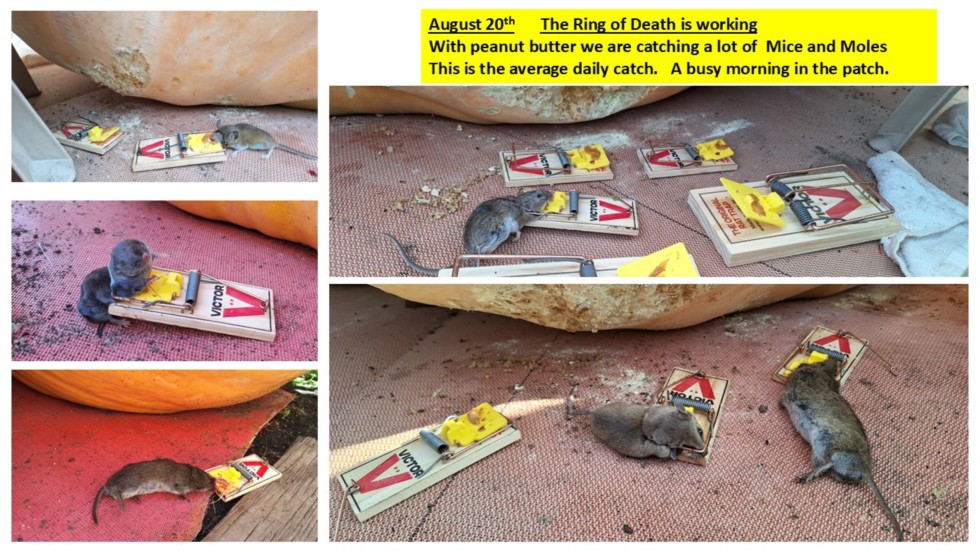 We are averaging about 6-7 kills per day from the "Ring of Death-2" traps that we set up around each pumpkin. Lots of small nibbles on most of the pumpkins.