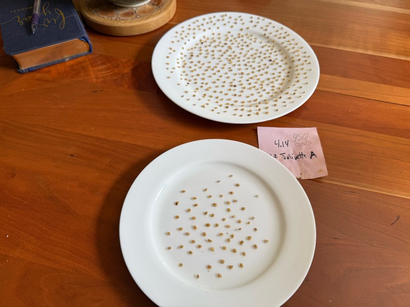 Here are the first of many tomato seed harvests. This is the 4.14 Young 2025 ( 10.2 Jolivette x open) and has roughly 450 seeds. We have seeds from a 3.95 Young 2025 ( 7.91 Trombley x open) fermenting. Once ripe it takes us about 10 - 14 days before they are ready.
