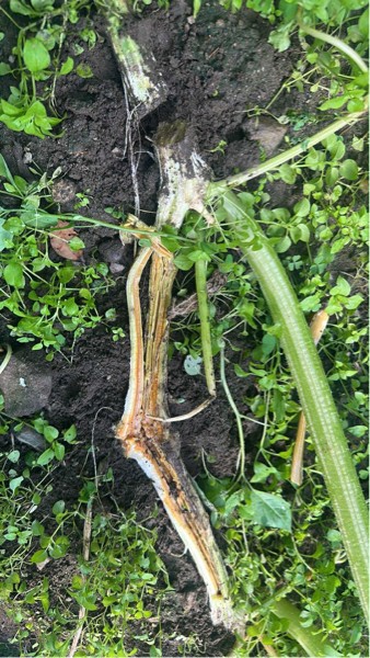 Yep. Part of the vine was rotted. I noticed two leaves that were straight yellow and then noticed this below. I'll be doing an oxidate drench tonight in the patch. Also, with the cooler daytime and night temps, I'll be backing off on the amount of Water I feed them