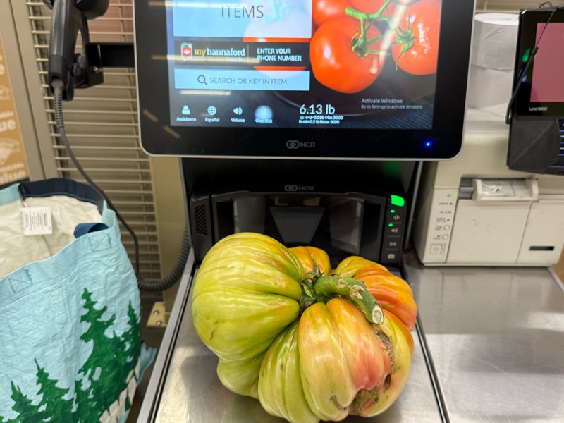 We had another tomato blush when we got back from Woodstock CT. This weighed 6.13 pounds and is from our 6.48 Young seed. It went a little lighter than we thought and had a circumference of 27.5 inches.