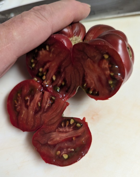 Well this is a megabloom tomato grown on the seed from last year's megabloom Cherokee Purple. I pollinated it with pollen from my competition Domingo plants. It will be fun to see what happens next year.