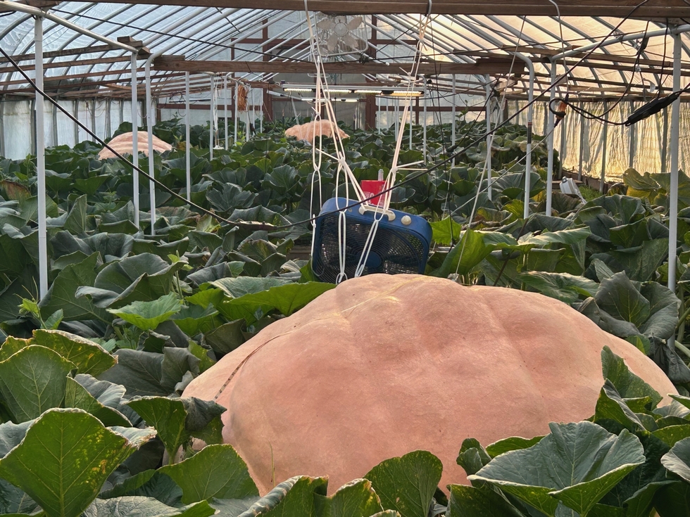 Sixteen more nights for Hope to keep inching along until she gets harvested for Hard Rock. The other two pumpkins in the background are getting big too! Fordzilla, my 2177 fruit at the far end of the greenhouse, keeps surprising me with gains that have her creeping ever closer to Hope! In fact, I think 'Zilla will pass Hope in the OTT race before Hope is harvested. I'm considering making a second trip to California with Fordzilla to Half Moon Bay. Making that drive twice sounds mind numbing. That would leave thirty one more days for 'Zilla to fatten up. You never know when they will slow down to a crawl, but she seems to have quite a bit more growing to do. The fruit in the middle is growing on my 2301 Pugh plant. Between day 80-90 it put on 140 pounds. It is starting to develop skin cracks as the pumpkin continues to grow after its skin has stopped growing. I doubt that it will make it to 2000 pounds, but if it goes a little bit heavy, you never know! It will most likely go to Bauman's on October 4th. The finish line is in sight. But there is still time for bad things to happen. Isn't this fun?